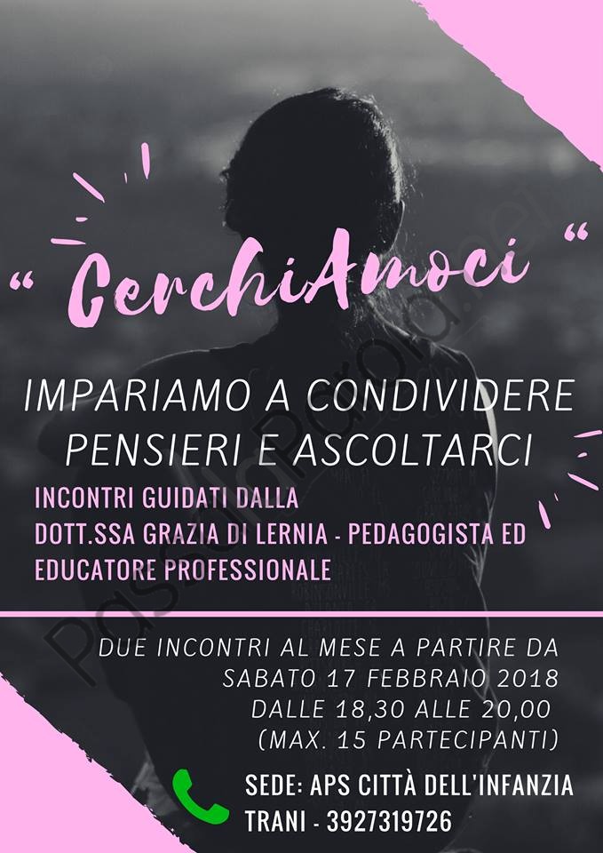 Quante volte abbiamo sentito la necessità di parlare? Quante volte avremmo voluto che la nostra voce fosse semplicemente ascoltata? Quante volte vorremmo che i nostri pensieri trovassero risposte o condivisione? Quante volte ci siamo sentiti soli tra migliaia di persone? Questi sono i quesiti a cui cerca di dare risposte il progetto #CerchiAmoci targato Città dell’Infanzia a cura della dott.ssa Grazia Di Lernia, pedagogista ed educatore professionale, redattrice nella rubrica “apprendimento e relazioni” sul portale cittadellinfanzia.it. “Benvenuti. Voi siete la risposta ad un sogno, una percezione, una sfida”. Ecco l’incipit del primo incontro che ha avuto luogo il 17 febbraio presso la sede di Città dell’Infanzia – Trani. E’ proprio di sfida trattasi, essendo, questo “congelamento” del tempo e dello spazio, il tentativo di aprire uno squarcio su una vita troppo spesso complicata e frenetica che ci rende difficile il compito di interpretare e soffermarsi sulle parole o sulle emozioni. Tutto scorre troppo veloce e “afferrarci” diviene una corsa contro il tempo. Ogni nuovo progetto è sempre ispirato da qualcosa o qualcuno. E quando anime speciali si incontrano, divengono generatrici straordinarie di idee e Antonella Pagone, redattrice nella rubrica “pensieri e parole” di cittadellinfanzia.it ha permesso al vento di soffiare nella giusta direzione, portando Grazia Di Lernia a sferrare il colpo finale nel cammino decisionale di quest’idea. Gli incontri, bimensili, partono dalla volontà di creare un gruppo di persone per imparare a condividere i propri pensieri attraverso l’ascolto reciproco. L’obiettivo di tale percorso non è fare incontri terapeutici o risolvere le problematiche dei partecipanti, ma creare l’opportunità di mettere in comune le proprie riflessioni, cogliendo nuovi risvolti delle proprie idee, mettendole in comune. Gli appuntamenti scanditi da role playing, simulazioni, ascolto di musica orientata all’attivazione di specifiche emozioni. Il percorso mirerà a stimolare il pensiero positivo e verrà condotto dalla dott.ssa Grazia Di Lernia, facilitatore della comunicazione, che veicolerà le discussioni in modo discreto ed armonico. Il prossimo incontro è sabato 3 marzo, alle 18,30, e approfondirà l’aspetto percettivo della comunicazione cercando di ricorrere ai cinque sensi, gli unici in grado di identificare le “trappole” comunicative. Lo spazio, in mezzo alla folla, sta per trovare il suo palpito. #CerchiAmoci riparte da qui, da Città dell’Infanzia, guidato dal calore di un camino che scalda mente e cuore.