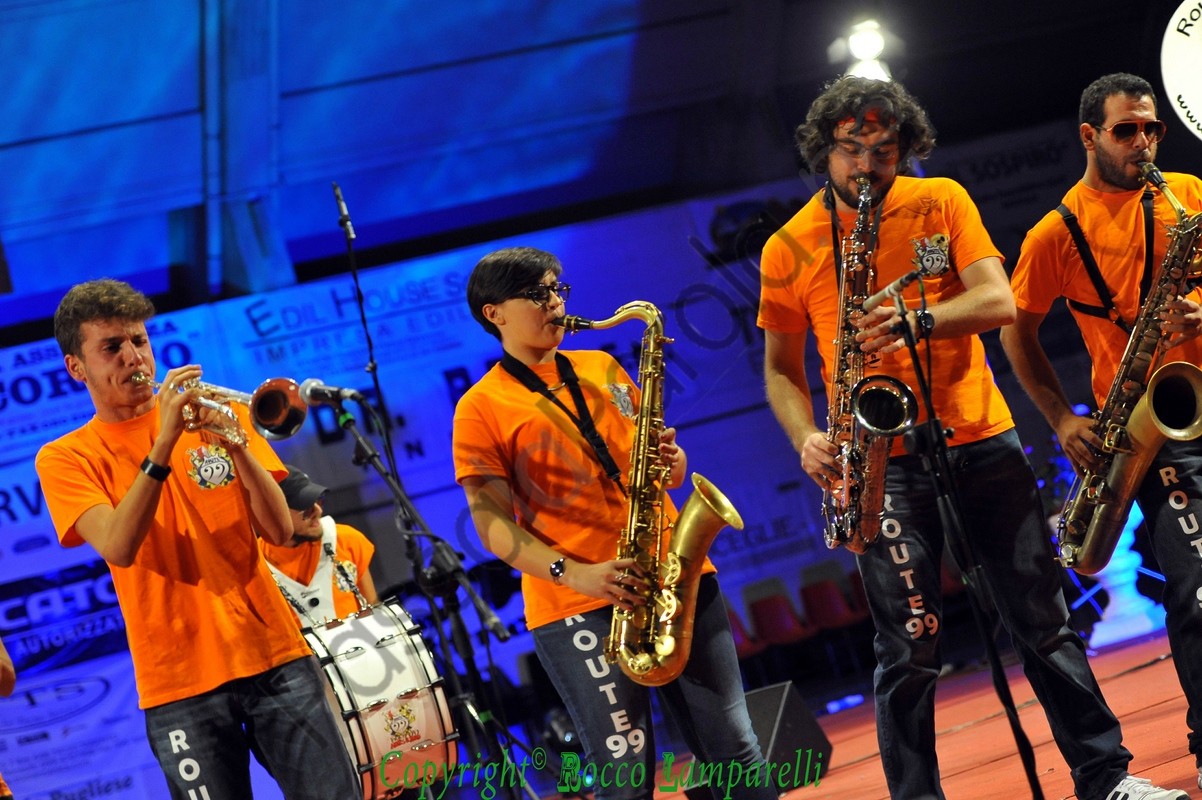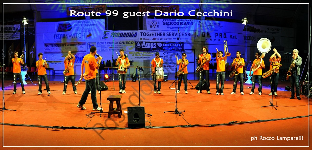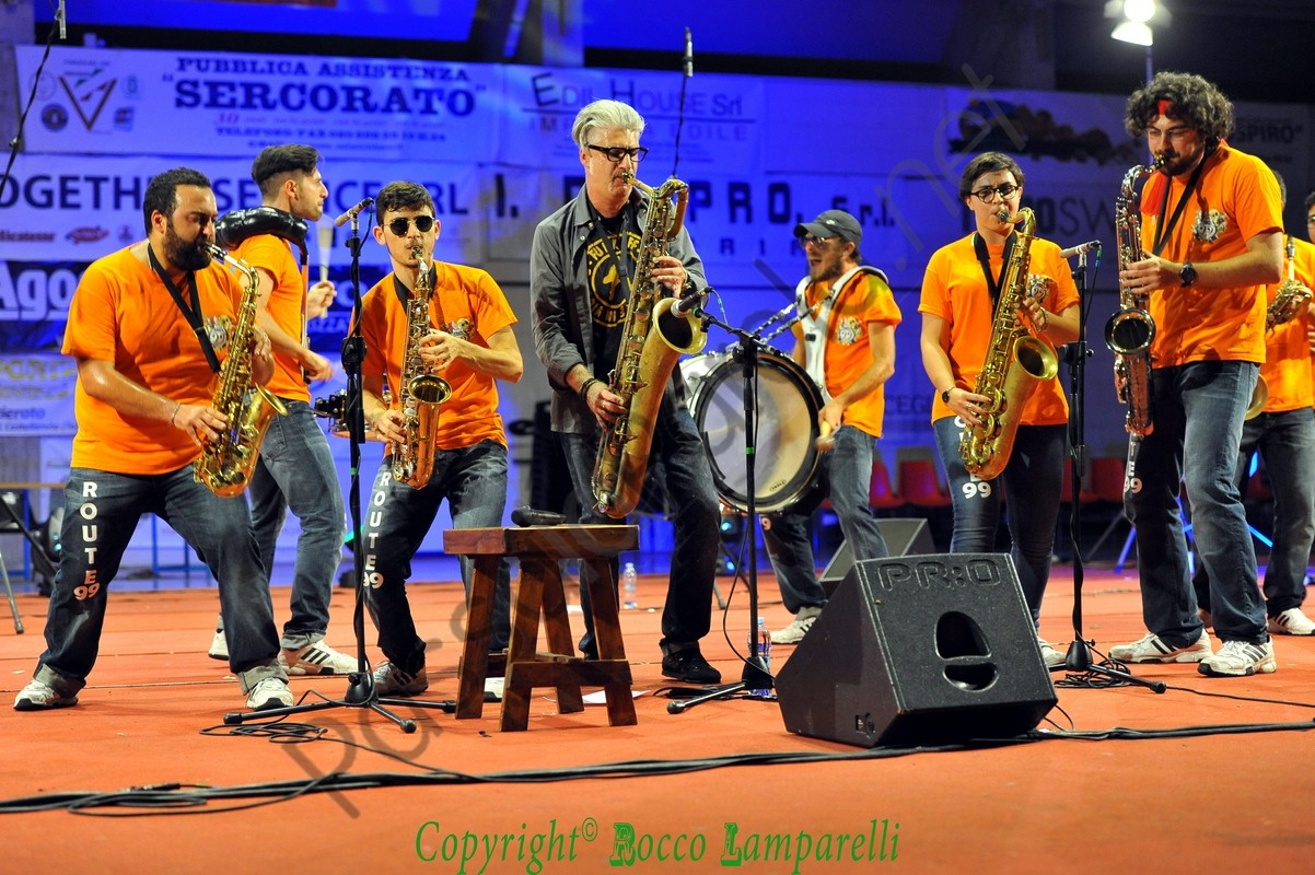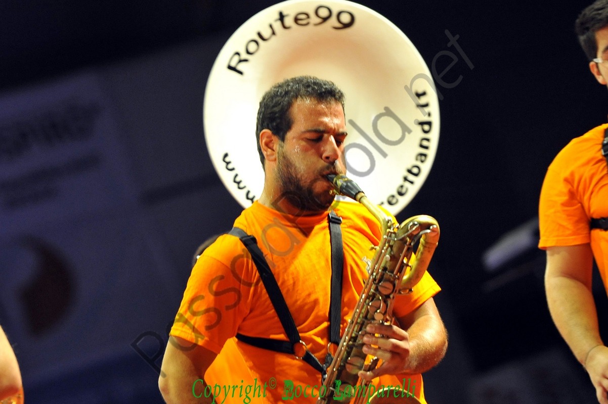 Segue irrompendo dal fondo del PalaColombo la ‘Route 99 Street Band’, nata nel 2012 ad opera di Giuliano Teofrasto, e subito viene instaurata una bella complicità tra musicisti e pubblico. Quest’ultimo viene spesso sollecitato a partecipare in maniera attiva al concerto, coinvolto con leggerezza e brio, accompagnato in un percorso tra le nuances della musica jazz e specialmente attraverso diversi pezzi del maestro Dario Cecchini (proveniente dalla street band ‘Funk Off’), che si accoderà alla Route 99 in un magico gioco di assioli e simbiosi armonica.