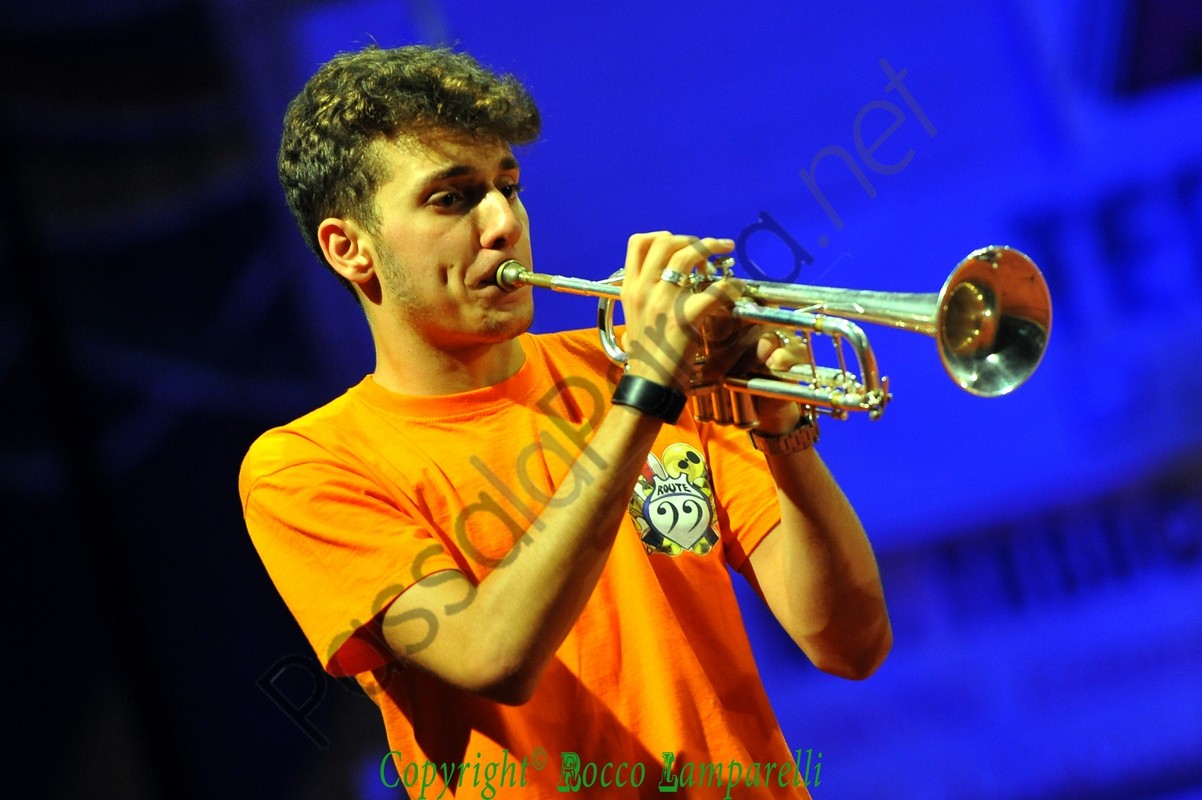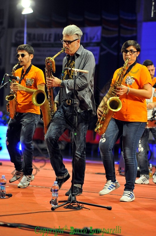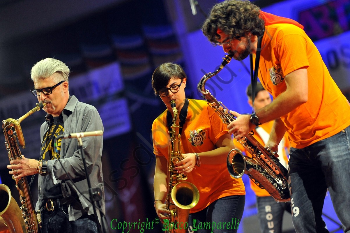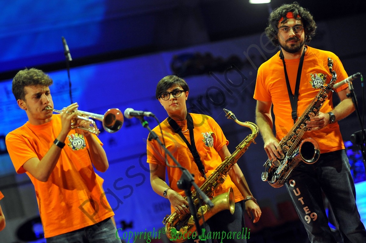 Segue irrompendo dal fondo del PalaColombo la ‘Route 99 Street Band’, nata nel 2012 ad opera di Giuliano Teofrasto, e subito viene instaurata una bella complicità tra musicisti e pubblico. Quest’ultimo viene spesso sollecitato a partecipare in maniera attiva al concerto, coinvolto con leggerezza e brio, accompagnato in un percorso tra le nuances della musica jazz e specialmente attraverso diversi pezzi del maestro Dario Cecchini (proveniente dalla street band ‘Funk Off’), che si accoderà alla Route 99 in un magico gioco di assioli e simbiosi armonica.