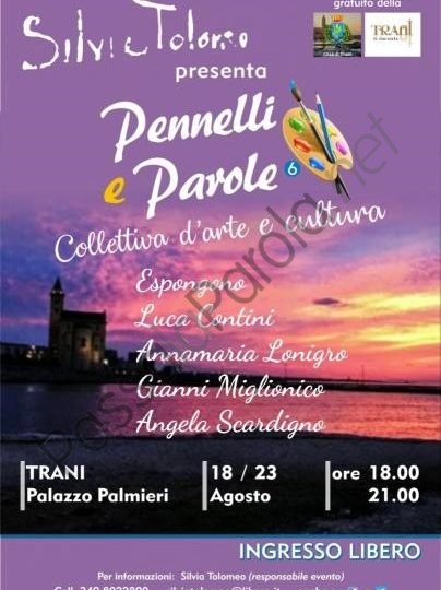 L’estate tranese prende il via con numerosi eventi in programma. A partire da martedì 18 fino a Domenica 23 agosto 2020 , si terrà la mostra d’arte e cultura intitolata “Pennelli e parole”. Nello splendido scenario del porto di Trani, nel palazzo Palmieri, piazza trieste 8, la nuova edizione sarà diretta da Silvia Tolomeo, che esporrà sue opere inedite, e vedrà la partecipazione di numerosi artisti esponenti: Angela Scardigno, Annamaria Lonigro e, per la prima volta Luca Contini che presenterà opere con la sua tecnica particolare su carta, prediligendo la raffigurazione di volti.